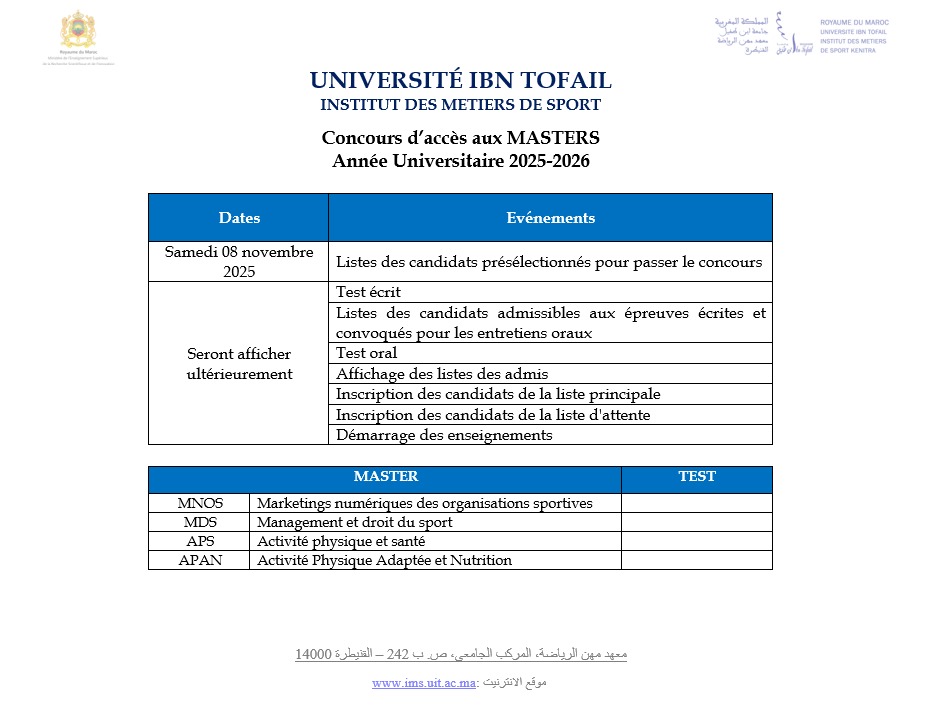 Concours d’accès à l’Institut des Métiers de Sport Année Universitaire 2025-2026
